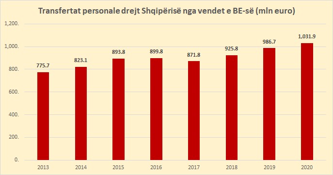 Në vitin 2020, flukset e parave të dërguara nga rezidentët e BE-së drejt vendeve jashtë BE-së, të referuara si transferta personale, arritën në 34,1 miliardë euro, një rritje prej 3% krahasuar me 33,2 miliardë euro në vitin 2019. Pjesa më e madhe e transfertave personale përbëhet nga flukse të parave të dërguara nga emigrantët në vendin e tyre të origjinës. Flukset hyrëse në BE arritën në 12.0 miliardë euro, një rënie prej 6% krahasuar me 12.8 miliardë euro të regjistruara në vitin 2019. Daljet jashtë BE-së kanë ruajtur një trend në rritje që nga viti 2015, duke u rritur me 33% që nga ai vit. Por, duke qenë se flukset hyrëse kanë mbetur konstante, kjo ka rezultuar në një bilanc negativ në rritje prej 22.1 miliardë eurosh për BE-në kundrejt vendeve jashtë BE-së në. Në vitin 2020, Kroacia (2.7%), Rumania (1.4%) dhe Letonia (1.3%) gjeneruan teprica të transfertave personale që kontribuojnë në më shumë se 1% të PBB-së së tyre përkatëse. Në të kundërt, Franca dhe Spanja gjeneruan deficite të transfertave personale që përfaqësonin -0.5% të PBB-së së tyre përkatëse kundrejt pjesës tjetër të botës. (MONITOR)