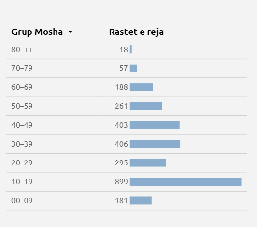 Në bazë të këtyre të dhënave, nga mosha 20 deri në 19 vjeç janë infektuar 295 persona, nga 30 deri 39, janë infektuar 406, nga 40 deri në 49 janë infektuar 403.