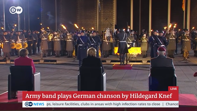 Në një ceremoni të mbajtur nën dritën e pishtarit, Bundeswehr, forcat e armatosura federale të Gjermanisë, i dhanë lamtumirën kancelares gjermane, Angela Merkel. Kjo lloj ceremonie është bërë jozyrtare për ministrat e mbrojtjes, presidentët dhe kancelarët.