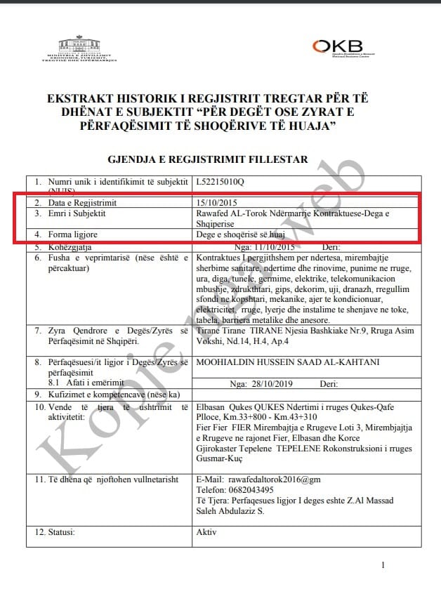Kompania fituese e kësaj kontrate është regjistruar në Shqipëri në vitin 2015, si degë e shoqërisë së huaj me të njëjtin emër, të regjistruar në Riad të Arabisë Saudite.