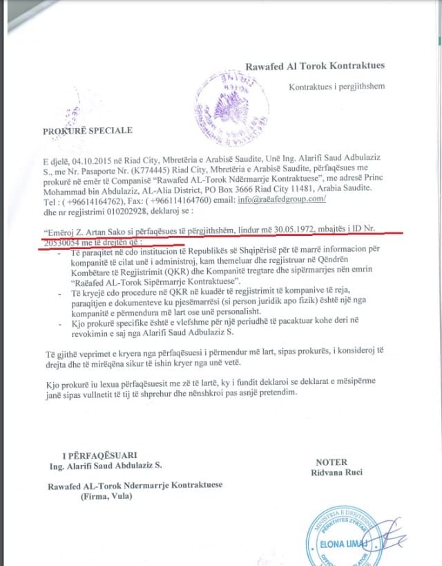 Sako autorizohej që të merrte çdo informacion në institucionet shqiptare për kompaninë “Rawafed ”.