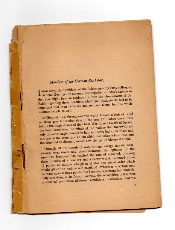 Në vitin 1936, Hitleri ‘shpërndau’ (ose pezulloi) Rajhstagun, në mënyrë që, sipas tij, «populli gjerman të jepte verdiktin e tij për udhëheqjen time». Kam një kopje të fjalimit të tij në një broshurë të vjetër, të përkthyer në anglisht dhe të botuar nga M Műller & Sohn në Berlin. U shpërnda gjerësisht dhe e gjeta në një tezgë bric-à-brac në qytetin universitar të Lviv në Ukrainë.