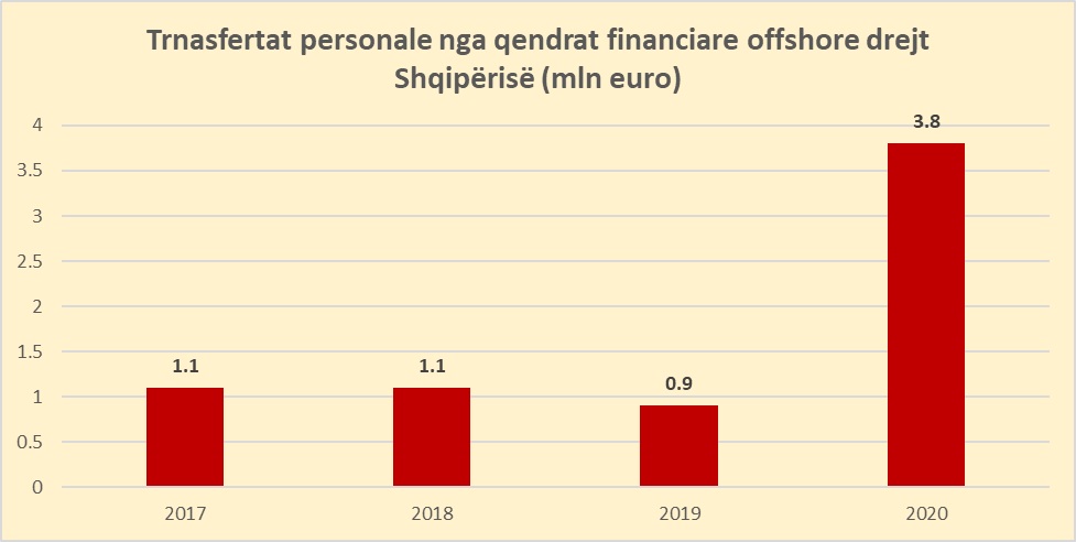 Shuma e transfertave personave që janë dërguar nga këto qendra financiare offshore është më e lartë sesa ajo e dërguar nga shtete të tilla si Holanda (3.2 milionë euo), Norvegjia (2.3 milionë euro), Bullgaria (1.2 milionë euro), etj, ku në këto të fundit përfshihen edhe transfertat e emigrantëve.