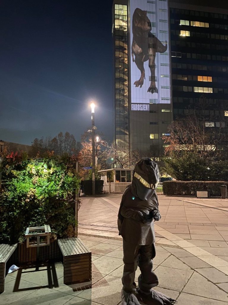 Programi i Kombeve të Bashkuara për Zhvillim (UNDP) në Kosovë së bashku me Zyrën e Kryeministrit projektuan një siluetë dinosauri në ndërtesën e Qeverisë mbrëmjen e kaluar për të shënuar fundin e samitit global të klimës COP26 në Glasgow dhe në mbështetje të fushatës globale të UNDP-së për ndryshimet klimatike.