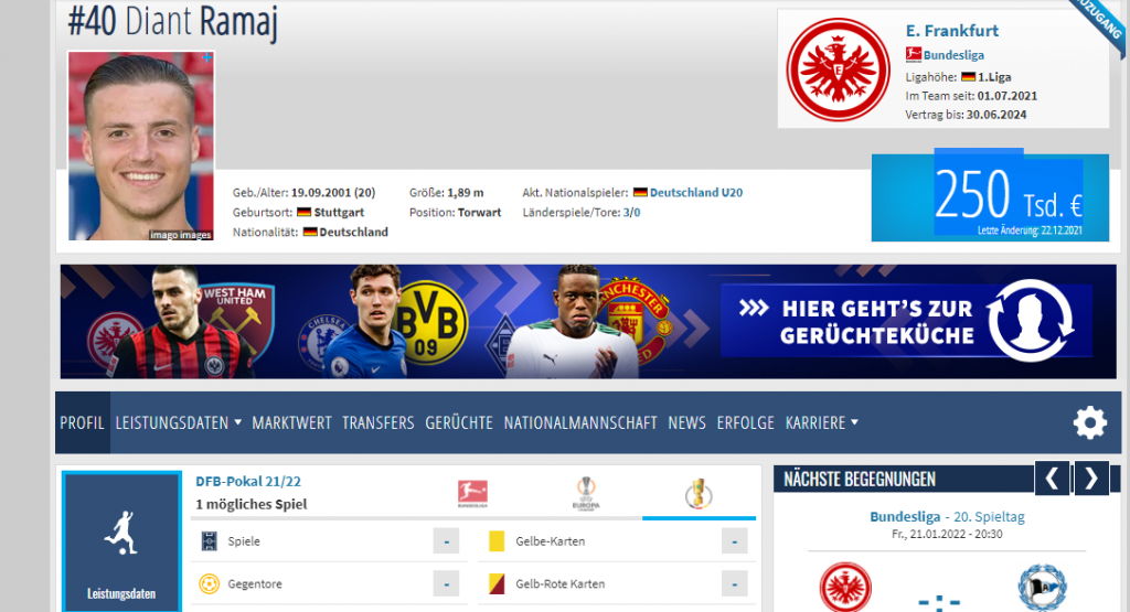 Shtatgjatë dhe vetëm 20-vjeçar, Diant Ramaj me prejardhje nga Kosova ka debutuar të dielën për Eintracht Frankfurt në barazimin 1 me 1 kundër Ausburg.