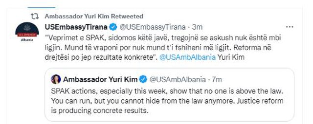 “Veprimet e SPAK, sidomos këtë javë, tregojnë se askush nuk është mbi ligjin. Mund të vraponi por nuk mund t’i fshiheni më ligjit. Reforma në drejtësi po jep rezultate konkrete”, shkruan Yuri Kim.