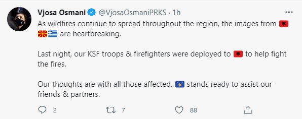 “Ndërsa zjarret e egra vazhdojnë të përhapen në të gjithë rajonin, imazhet nga Shqipëria, Maqedonia, Greqia janë zemërthyese. Natën e kaluar trupat tanë të FSK-së dhe zjarrfikësit janë vendosur në Shqipëri për të ndihmuar në luftën me zjarret. Mendimet tona janë me të gjithë ata që janë prekur. Kosova qëndron gati për të ndihmuar miqtë dhe partnerët tanë”