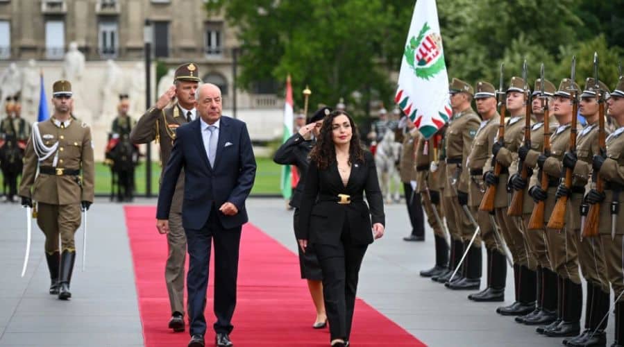 Presidentja Vjosa Osmani është pritur me nderime ushtarake nga homologu i saj në Hungari, presidenti Sulyok.