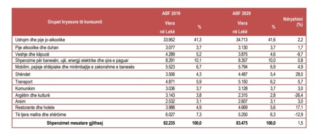 Sipas Anketës së Buxhetit të Familjeve të INSTAT, Në vitin 2020, shpenzimet mesatare mujore për konsum për një NjEF, të përbërë mesatarisht nga 3,6 persona, janë 83.475 lekë. Totali i shpenzimeve për konsum është 64,2 miliardë lekë në muaj për 768.963 familje. Vlerësimi i shpenzimeve mesatare mujore për konsum të NjEF-ve në vitin 2020, është 1,5 % më i lartë se në vitin 2019. Rritja e çmimeve të konsumit, në vitin 2020, krahasuar me vitin 2019, është 1,6 %. Uljen më të madhe të shpenzimeve mesatare për konsum mujor, në vitin 2020, e ka shënuar grupi “Argëtim dhe kulturë” me 26,4 %, krahasuar me vitin 2019, ndërsa rritja më e madhe është shënuar në grupin “Shëndet” me 28,0 %.
