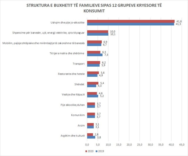 Edhe për ushqime ka një rritje të lehtë, me totalin e shpenzimeve që ka arritur në 41.6% nga 41.3% që ishte vitin e mëparshëm. Shqiptarët janë popullsi që shpenzojnë më shumë për ushqime, ndërsa në vendet e Bashkimit Europian, kjo peshë është 13% dhe në rajon më e ulët se 40%. Karantina ka ulur ndërkohë shpenzimet për kulturë dhe argëtim, pesha e të cilave ka zbritur në 2.8%, nga 3.8% një vit më parë.