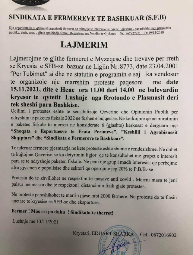 Fermerët kanë vendosur që të mblidhen sërish për një protestë paqësore në qendër të qytetit të Lushnjes, duke nisur që nga ora 11:00 deri në orën 14:00, për të sjellë kështu edhe ndryshimin e Paketës Fiskale 2022.