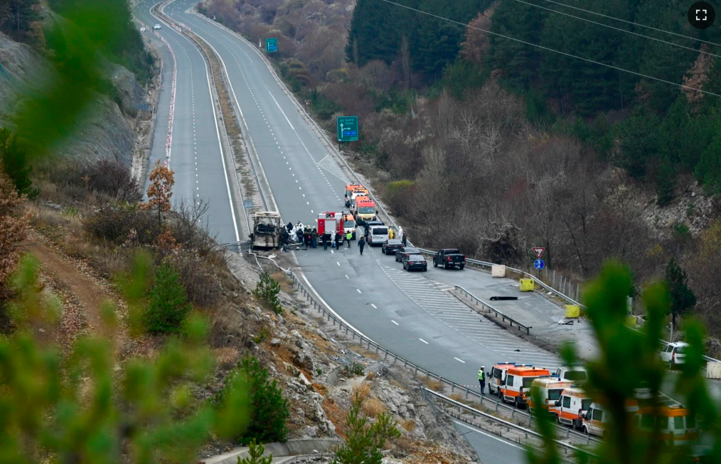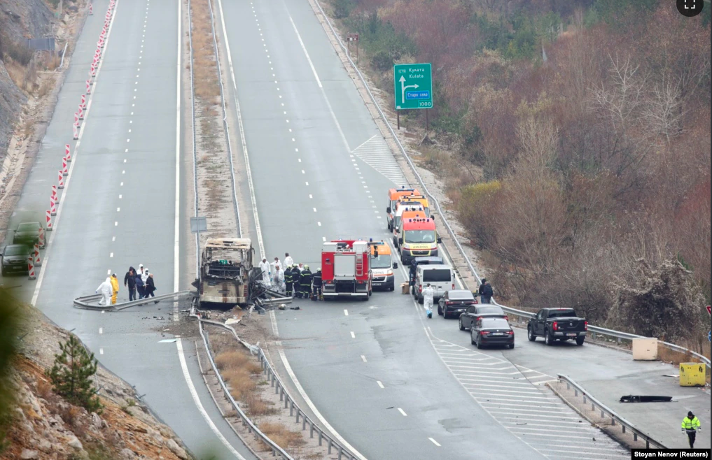 Zyrtarët duke punuar në vendin ku ndodhi aksidenti i një autobusi me targa të Maqedonisë së Veriut, në të cilin humbën jetën të paktën 46 persona, në një autostradë afër fshatit Bosnek, në jug të Sofjes, në Bullgari.