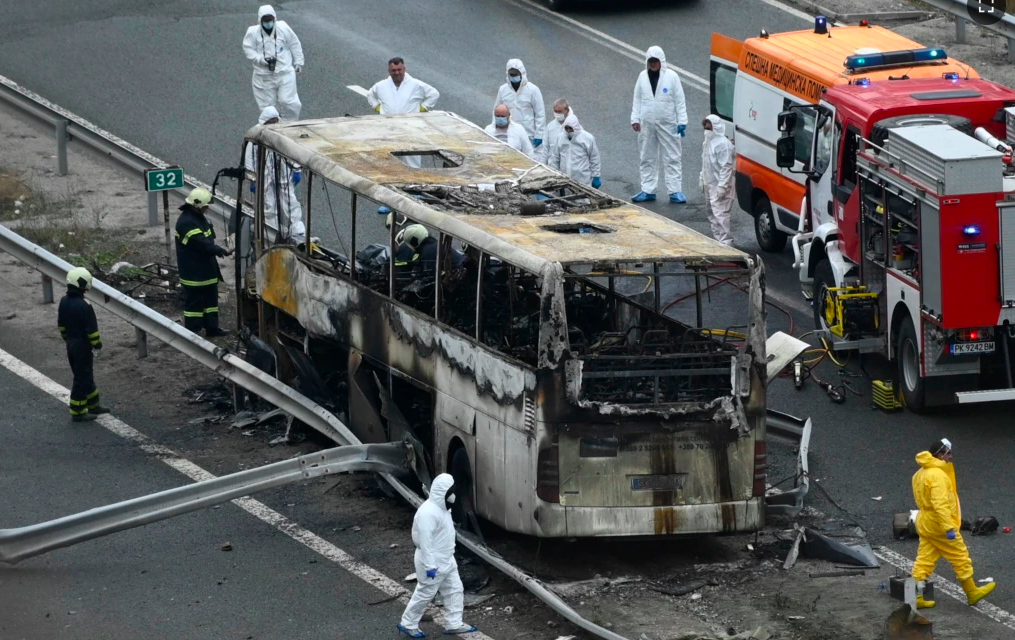 Zjarrfikësit dhe zyrtarët e mjekësisë ligjore pranë autobusit të djegur, në Bullgari.