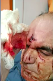 Personi që shihni në foto është kryetari i grupseksionit të Partisë Demokratike në “Kombinat” të Tiranës. Ai është dhunuar nga njerëzit e Lulzim Bashës brenda selisë së PD-së. Foto është shpërndarë në rrjetet sociale. Vec dhunës nga brenda selisë së PD-së është hedhur edhe gaz lotsjellës për larguar protestuesit.