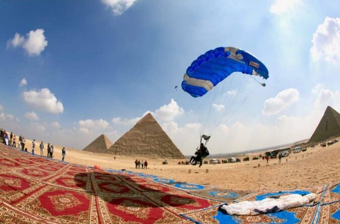 Dhjetra parashuta shumëngjyrëshe fluturuan mbi Piramidat e Mëdha të Gizës, një nga Shtatë mrekullitë e Botës së Lashtë, duke nisur festivalin e katërt ndërkombëtar të parashutizmit të quajtur “Kërce si Faraoni” në Egjipt.
