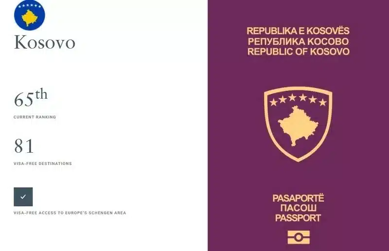 Pasaporta e Republikës së Kosovës ka shënuar ngritje në renditje në Indeksin e Pasaportave ‘Henley’, duke u renditur për vitin 2025 në vendin e 65-të në botë, me 81 destinacione pa viza, përfshirë edhe qasjen e lirë në zonën Shengen.