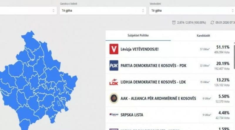 Lëvizja Vetëvendosje, ka fituar 57 ulëse, me 51.11 për qind të votave, apo gjithsej 486,994 vota.
