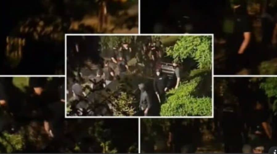 Në videon që e ka siguruar N1, që është filmuar nga një ndërtesë, shihet grupi i burrave të veshur me të zeza, maska dhe jelekë antiplumb, transmeton Telegrafi.
