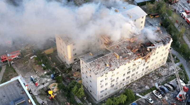 Sulmi, që ndodhi para agimit, e shkatërroi një pjesë të ndërtesës dhe shkaktoi zjarr në të paktën tri kate, tha guvernatori rajonal, Oleg Synegubov në Telegram.