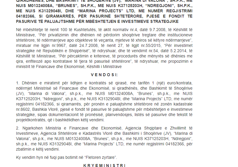 Të gjitha do të marrin me qera me vlerën 1 euro mbi 57 mijë metra katrorë pronë shtetërore, më konkretisht vendin ku sot ndodhet porti i Vlorës.