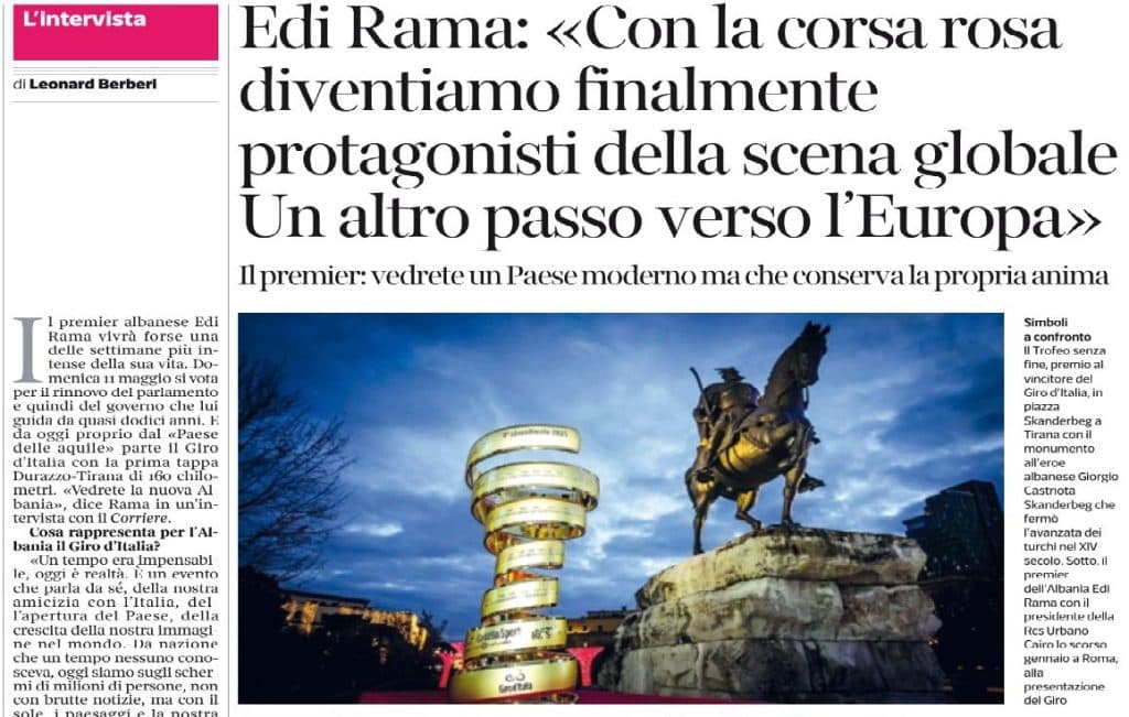 “Me “Giro d’Italia” bëhemi më në fund protagonistë në skenën globale, një hap tjetër drejt Europës”. Ishin këto fjalët e kryeministrit Edi Rama në një intervistë të gjatë të dhënë për gazetën italiane “Corriere della Sera”. Kreu i qeverisë shqiptare flet jo pa mburrje për ato që sipas tij ka arritur në qeveri.