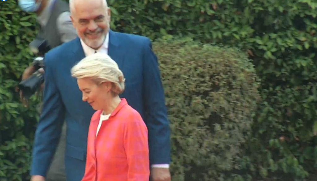 Presidentja e KE u prit nga kryeministri Edi Rama në Pallatin e Brigadave me një ceremoni shtetëore. Leyen, zgjodhi që Ramën ta përshëndeste me dorën në zemër, duke respektuar masat anti Covid. Pa maskë, e veshur me xhaketë rozë, Leyen bëri fotografinë zyrtare me Ramën brenda ambienteve të Pallatit të Brigadave. Pas takimit me dyer të mbyllura, pritet që të ketë dhe një konferencë për shtyp nga ana e tyre. Rreth orës 10:00 ajo do të takohet me presidentin Ilir Meta në Presidencë.