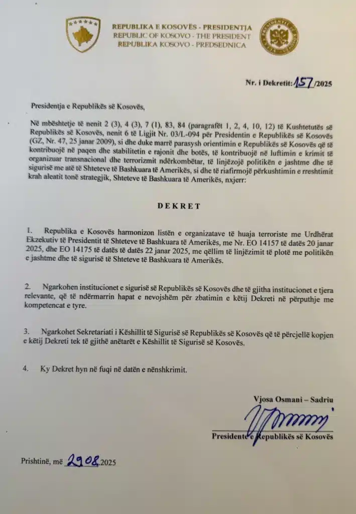 Presidentja e Kosovës, Vjosa Osmani, ka lëshuar një dekret me të cilin ka harmonizuar listën e organizatave të huaja terroriste me urdhrat ekzekutivë të presidentit amerikan, Donald Trump.