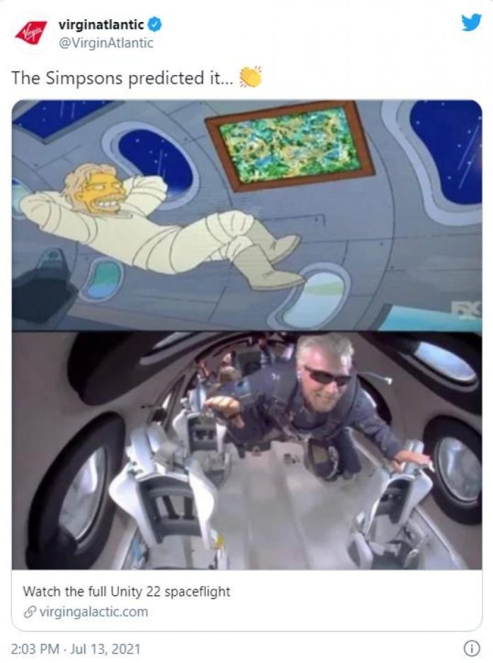 Fluturimi historik VSS Unity u transmetua drejtpërdrejt dhe Branson dhe pesë anëtarë të tjerë të ekuipazhit kaluan disa minuta në hapësirë. Ai e përshkroi udhëtimin si ” një përvojën më unike të një jete të tërë “. Por krijuesit e Simpson e kishin parashikuar këtë udhëtim në një episod të vitit 2014 me titull “Lufta e Artit” ku bosin e Virgin është duke udhëtuar në hapësirë!