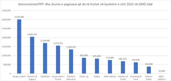 Për vitin 2022, kufiri i lejuar i pagesave neto për kontratat koncesionare/PPP, prej 5% e të ardhurave tatimore të pritshme të vitit 2021, është rreth 22.95 miliardë lekë, por vlera e parashikuar për tu paguar është 13.8 miliardë lekë ose 3 3 për qind të totalit të të ardhurave tatimore të parashikuara për vitin 2021, prej rreth 459.1 miliardë lekë.