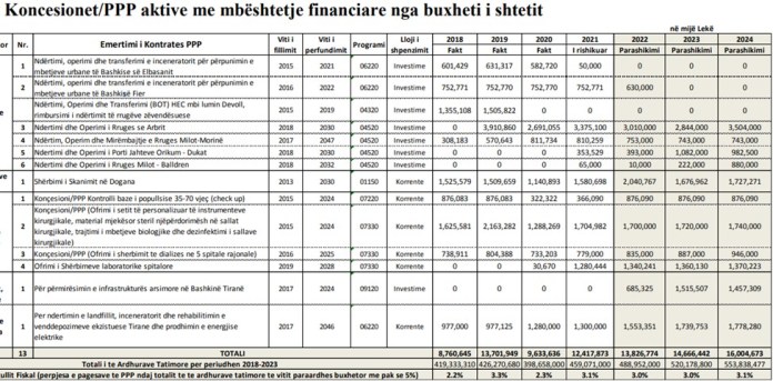 Ministria e Financave njoftoi se fondet buxhetore të planifikuara për vitin 2021, sipas planit të ndryshuar, me destinacion mbështetjen buxhetore për kontratat koncesionare/PPP, rezultojnë në total rreth 12.42 miliard lekë. Nga këto, rreth 5.4 miliard lekë investime dhe rreth 7.01 miliardë LEK shpenzime korente.