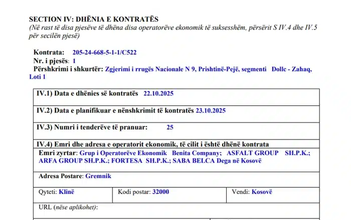 Tenderi është fituar nga Grupi i Operatorëve Ekonomikë që përfshin kompanitë: Benita Company, Asfalt Group SH.P.K., Arfa Group SH.P.K., Fortesa SH.P.K. dhe Saba Belca Dega në Kosovë.