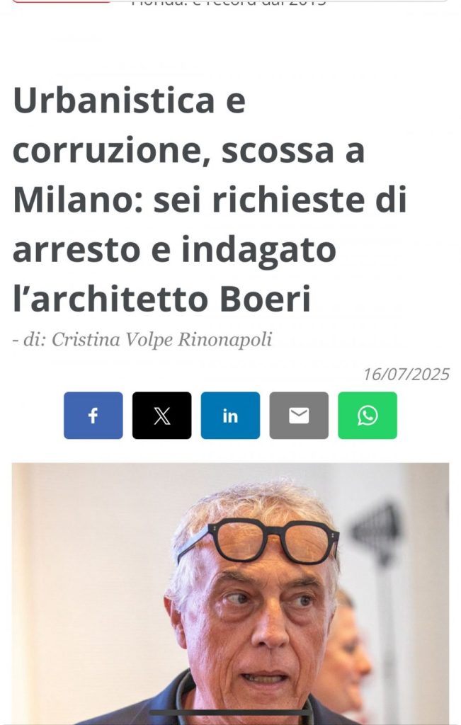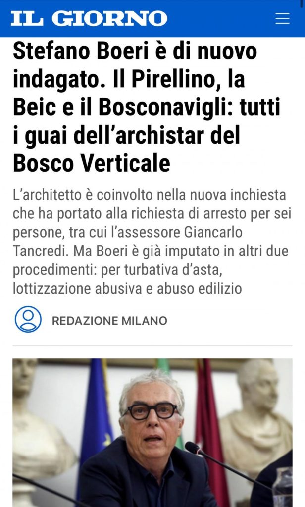 Stefano Boeri, arkitekt i njohur është i përfshirë për herë të tretë në dy vitet e fundit në procedime gjyqësore lidhur me urbanistikën dhe abuzimet në ndërtim. Rezulton person nën hetim e jo në masë ndalimi.