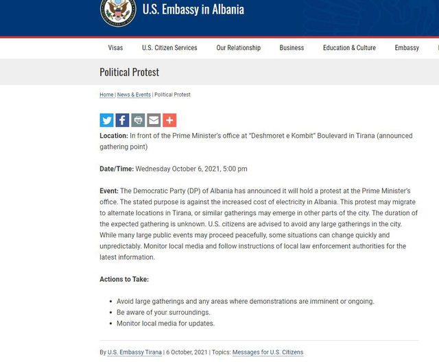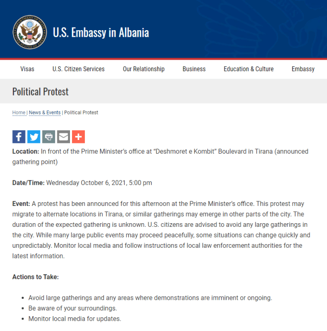 Në vijim, thirrja për qytetarët amerikanë në Shqipërinë mbetet e njëjtë: të shmangin tubimet.