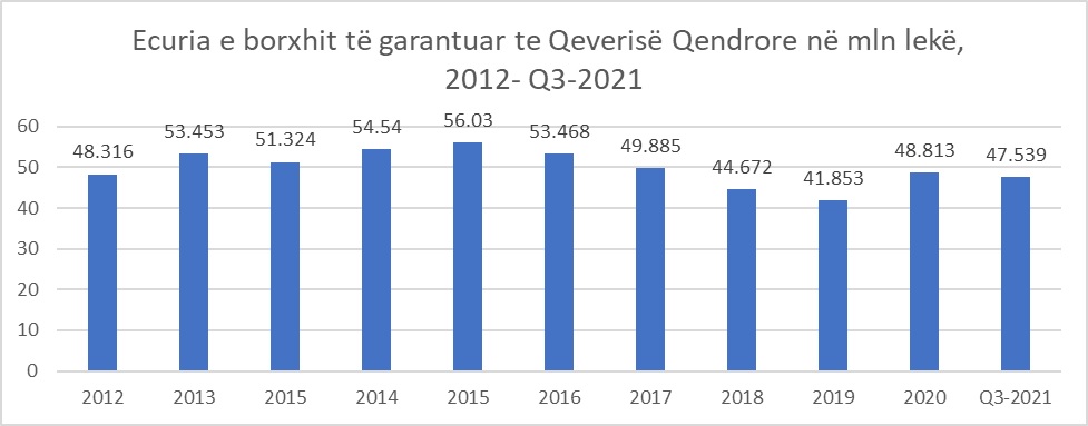 Vlera totale e borxhit të garantuar arriti 47 miliardë lekë në fund të tremujorit të tretë 2020, duke zënë 3.7 për qind të totalit të borxhit publik.
