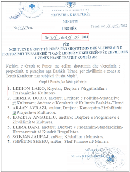 Asokohe ajo ka qenë drejtoreshë në Ministrinë e Kulturës dhe pjesë e grupit të punës që bënë vlerësimin e Teatrit Kombëtar, nëse duhej shembur apo jo. (Shiko shkresen me poshte)