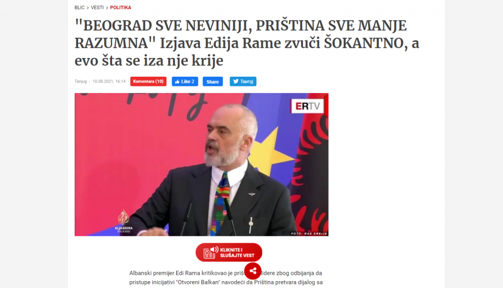 Kryeministri shqiptar Edi Rama kritikoi udhëheqësit e Prishtinës për refuzimin e bashkimit me nismën “Ballkani i Hapur”, duke deklaruar se Prishtina po e kthen dialogun me Beogradin në një monolog që irriton aleatët strategjikë.“, kështu e nis artikullin media serbe Blic, kur merret me ato se çfarë ka shprehur kryeministri Edi Rama.