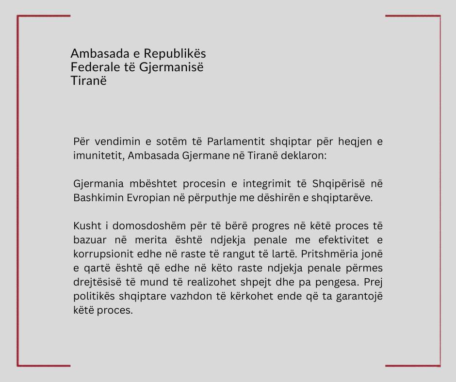 Lidhur me vendimin e sotëm të Parlamentit shqiptar rreth heqjes së imunitetit Ambasada Gjermane deklaron: