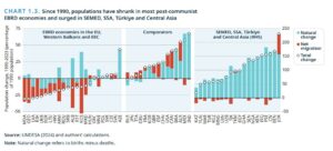 Grafikët e raportit tregojnë qartë se Shqipëria ka humbur rreth 40 për qind të popullsisë së vitit 1990 për periudhën 1990-2023, vetëm përmes emigracionit neto, niveli më i dytë më i lartë në Europë dhe në të gjithë grupin e ekonomive të BERZH.