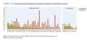 Studimi tregon se vendi po humbet më shumë profesionistë sesa arrin të tërheqë. Në krahasim me ekonomitë e tjera, Shqipëria pozicionohet në grupin e vendeve me emigracion të lartë të të arsimuarve, në nivele shumë më të larta se ekonomitë e Europës në Zhvillim, përveç Bosnjës, e cila ndër të tjera vuan nga konfliktet ndër-etnike dhe mungesa e stabilitetit politik.