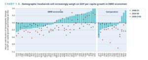 Raporti thotë se ky boshllëk i madh demografik po përkthehet në një frenim të ndjeshëm ekonomik për Shqipërinë. Në grafikun e dytë të raportit, BERZH mat për herë të parë ndikimin vjetor të demografisë në rritjen e PBB-së për frymë.