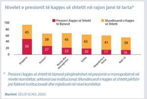 Presioni i kapjes së shtetit nga bizneset në Shqipëri është më i larti në rajon, sipas një raporti të fundit të SELDI- rrjeti i Europës Juglindore për Lidership, Zhvillim dhe Integritet. Presioni i kapjes së shtetit nga bizneset në vend vlerësohet me 50 pikë, shumë më i lartë sesa vendet e tjera të rajonit. Shteti i dytë pas nesh është Kosova, që e ka treguesin 27, ndërsa më të ulët e ka Mali i Zi në 16 (shiko grafikun).