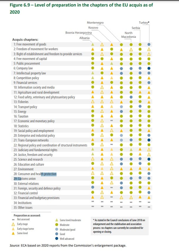Për sa i përket plotësimit të kushteve, përparim të lartë ka bërë vetëm Turqia. Nga 31 kritere, në 10 prej tyre Turqia kishte ecuri pozitive ndërsa për tre kritere, si lidhjet logjistike me BE-ne, ecuria e shkencës dhe legjislacioni i kompanive mori vlerësim shumë të lartë të ecurisë.