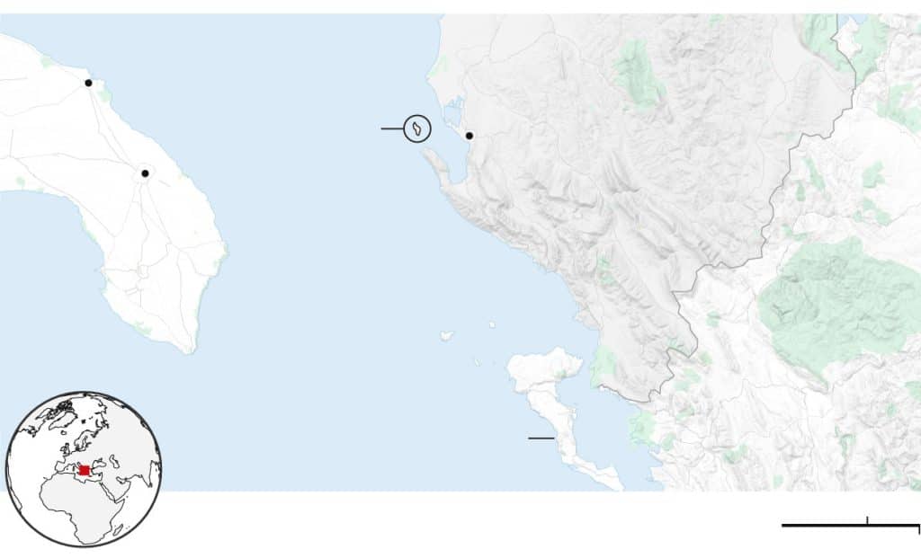 Kur mbërrita atje, në një ditë të kthjellët të korrikut 2024, zbulova që ishulli nuk është vend ku mund të humbësh lehtësisht: është i mbushur me tabela me kafka dhe kocka, që paralajmërojnë për minat nëntokë. Udhërrëfyesi im, Arbër Celaj, një komandant në marinën shqiptare, më ndaloi të shkoja shumë larg. Nuk donte të merrte ndonjë qortim nga eprorët e tij.