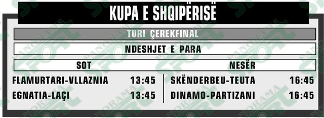 Rikthehet sot Kupa e Shqipërisë, ku do të zhvillohen dy ndeshjet e para të fazës çerekfinale në të njëjtin orar, 13:45.