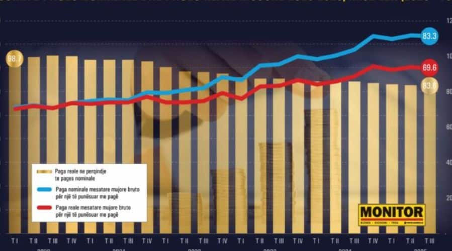 Paga nominale u rrit ndjeshëm, nga rreth 60 mijë lekë në vitin 2022 në mbi 83 mijë lekë në vitin 2024 dhe fillim 2025. Megjithatë, paga reale rritet shumë më ngadalë dhe në disa tremujorë madje shënon rënie krahasuar me ritmin e pagës nominale. Raporti i pagës reale ndaj pagës nominale bie në mënyrë të vazhdueshme, duke zbritur nga rreth 94% në fillim të vitit 2022 në rreth 83–83% në vitet 2024–2025. Kjo tregon se një pjesë gjithnjë e më e madhe e rritjes së pagave po gërryhet nga inflacioni.