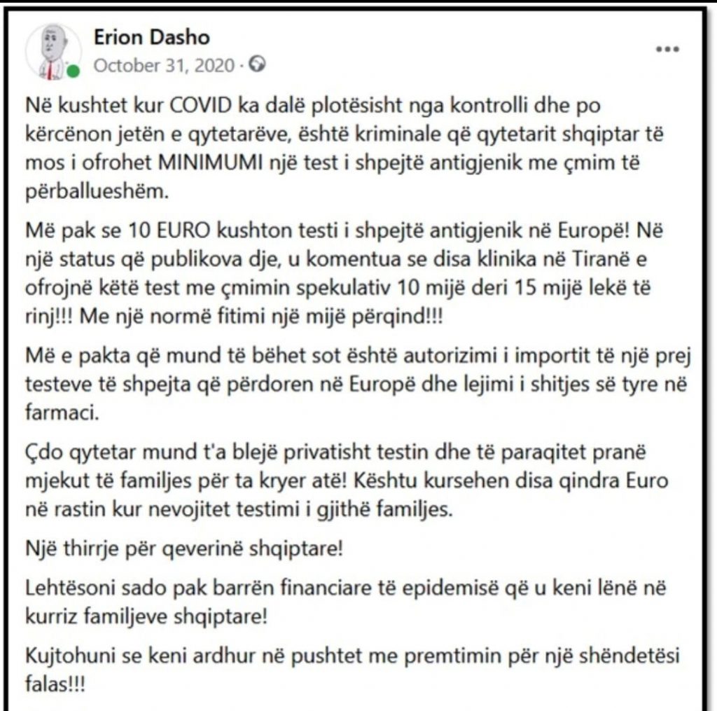 Duke nisur nga muaji gusht 2020 (kur sektori privat nisi të ofrojë testin për COVID) e deri më sot, vazhdoj të shkruaj për një fenomen tepër të dhimbshëm: Rrjepjen e paturpshme të qytetarëve shqiptarë nga spekulantët e sektorit shëndetësor privat.