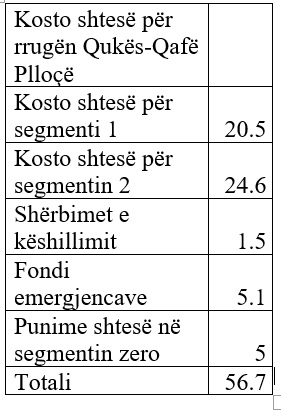 Ministria e Infrastrukturës përllogariti se, financimi në segmentin e parë kërkon 20,5 milionë euro shtesë, në segmentin e dytë 24.6 mln euro shtesë, shërbimet e këshillimit kërkojnë 1,5 mln euro, fondi emergjencave 5,1 mln euro, punime shtesë në hyrje 5 milionë euro (totali 56.7 mln euro).