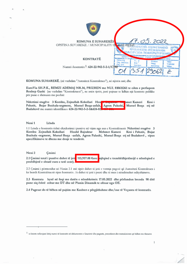 Sipas të dhënave publike, në maj të vitit 2022 është lidhur një kontratë për “Ndërtimin e rrugëve lokale në Budakovë”, me operatorin ekonomik fitues, në vlerë prej 113,957.08 euro.