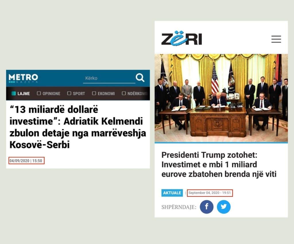 Këto janë dy lajme që kanë dalë në të njëjtën ditë, nga e njëjta ngjarje. Njëri nga atëherë Drejtori i Klan Kosova, Pec Srbija, që paralajmëronte 13 miliardë investime dhe tjetri nga atëherë Kryeministri Hoti që transmetonte zotimin e Presidentit Trump për 1 miliard euro investime. Dallimi është 12 miliardë euro. Pra, 12,000,000,000 euro.
