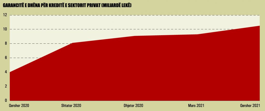 Mbështetja më e madhe e drejtpërdrejtë e sektorit privat nga qeveria ishte formula e ofrimit të garancive sovrane për sigurimin në sektorin bankar. Sipas informacionit të Ministrisë së Financave dhe Ekonomisë (MFE), në fund të muajit qershor 2021, shuma e garantuar për të dyja skemat e garancisë sovrane arriti në afërsisht 10.5 miliardë lekë.